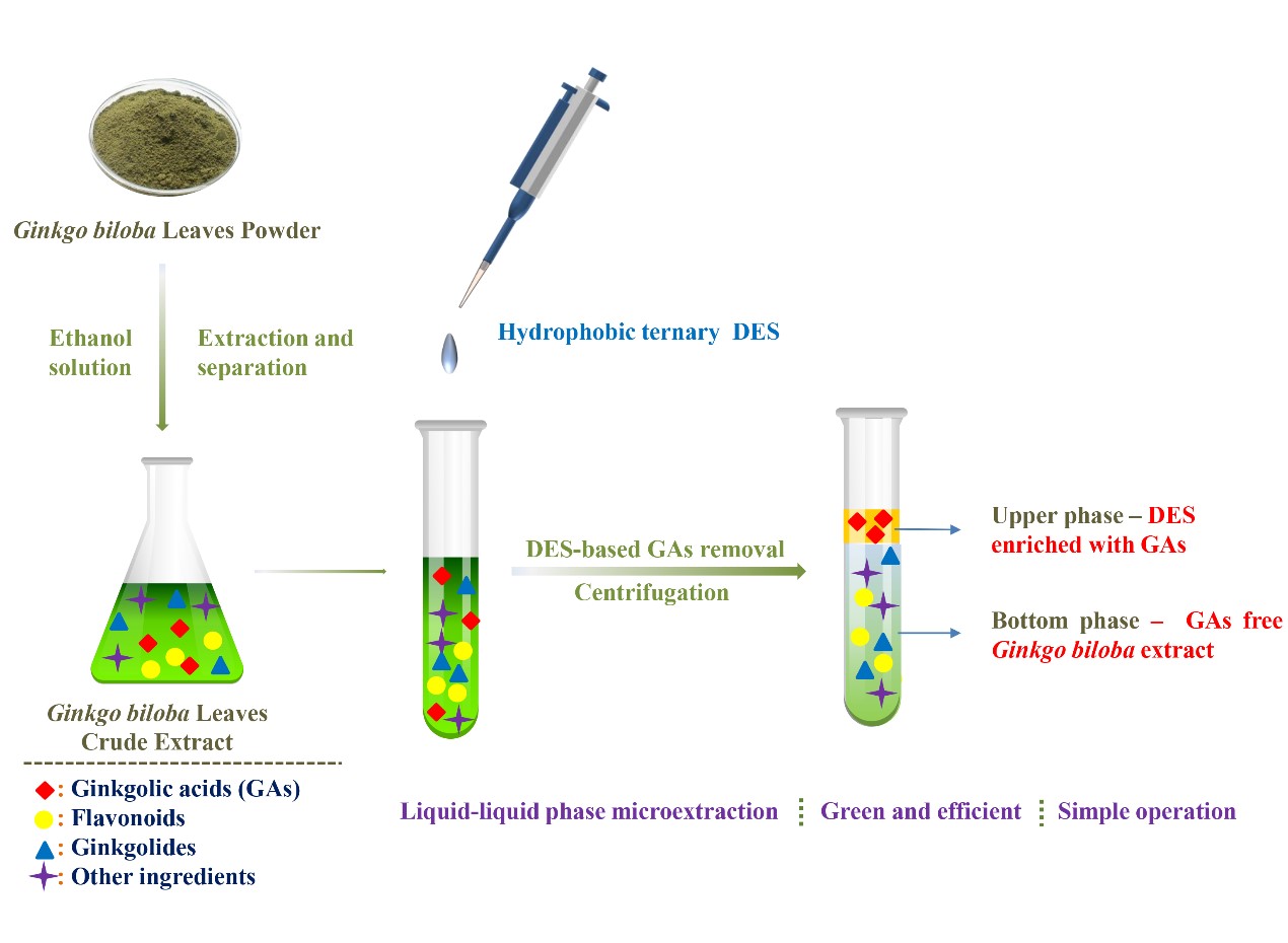 银杏是我国特有的多用途树种,属国家二级保护的稀有植物。我国是银杏的原产地,同时也是全球最大的银杏种植地,银杏叶资源占了世界总量的70 %以上。银杏叶提取物为银杏的干燥叶经有机溶剂提取得到的有效成分富集的一类产品,广泛应用于药物、保健品、食品添加剂、化妆品等领域,对心脑血管疾病、阿尔兹海默症等认知功能障碍治疗具有一定效果。银杏叶中存在的银杏酚酸是引起银杏制剂不良反应的主要原因,可引起细胞毒性、胚胎毒性、致敏、抑制酶系统以及轻微神经毒性等。因此,国内外标准规定,银杏叶提取物中银杏酚酸的含量不得高于5ppm。本研究根据银杏酚酸的结构特点,设计了一种三元疏水深共熔溶剂,应用液液微萃取技术高效脱除银杏酚酸,进行了一系列的设计优化,最终确定了最佳的脱除条件。在该条件下,银杏叶粗提物中的银杏酚酸含量可降低至5ppm以下。本研究开发的基于深共熔溶剂的液液微萃取技术应用于银杏酚酸的脱除,具有操作简单、绿色安全、高效节能的优点,为脱除银杏酚酸提供了新的思路。